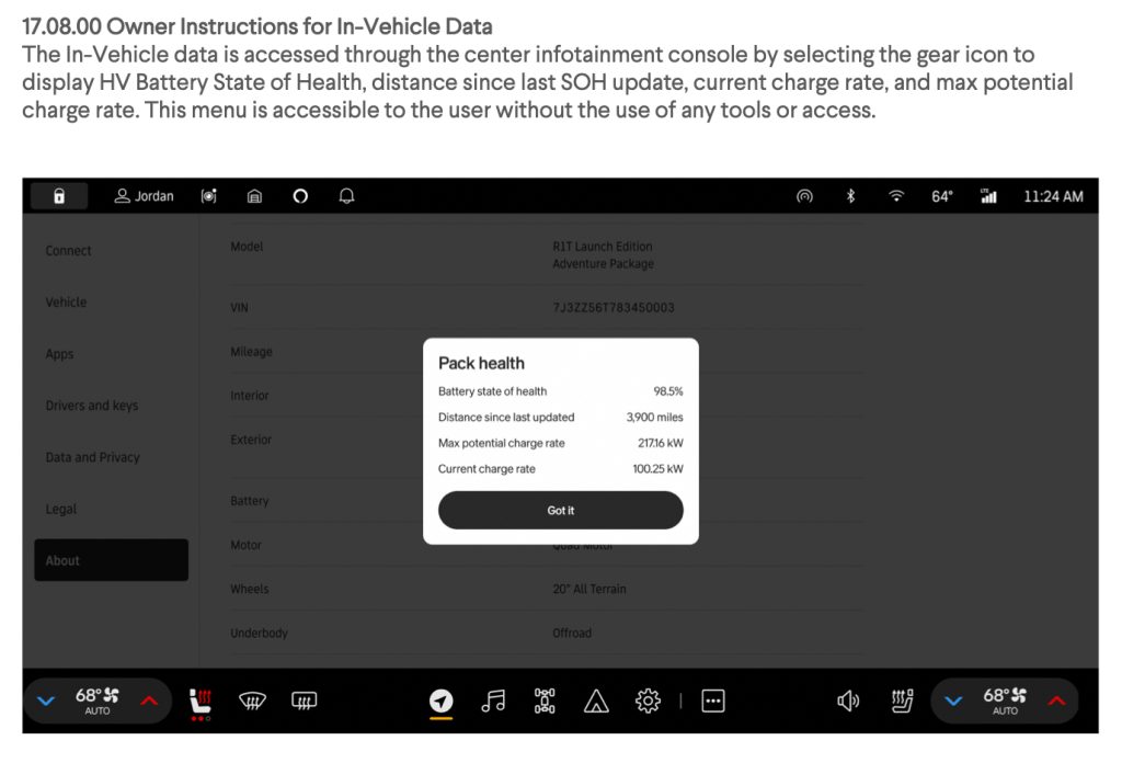 Notably, we also know the difference in range from the 20″ all-terrain tires, which reduce efficiency (as is the case on any vehicle). Per the certification, the R2 will have a range of 314 miles with all-terrain tires equipped, which isn’t all that bad of a loss all things considered.