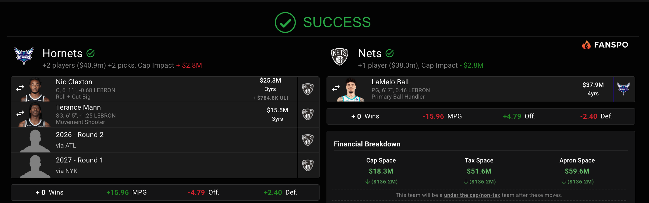 This is an interesting package going back to Charlotte. The Knicks’ 2027 pick is unprotected, and while New York should be very good, you never know. Claxton has lost some shine over the last couple years but could still be a decent long-term center option in Charlotte along with standout rookie Ryan Kalkbrenner. Mann is way overpaid on that deal, but maybe they could use it as a salary match in a future draft. There’s probably too much bad money coming back in this deal for Charlotte without enough draft assets. It’s bleak for the Nets right now.