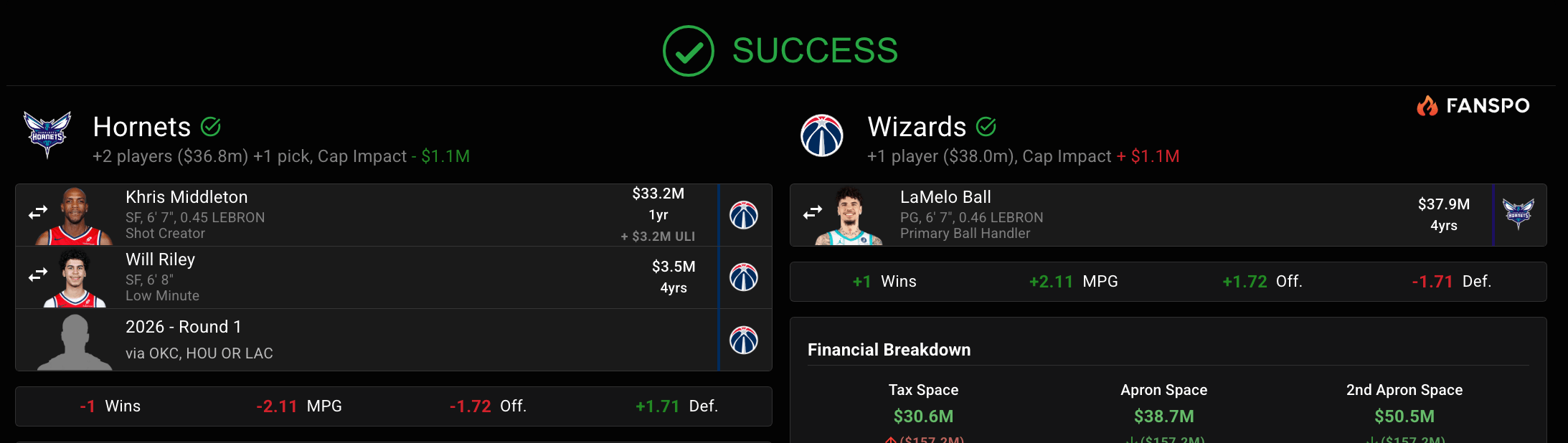 The pick included here is the Thunder’s 2026 selection, so it will likely be the last pick in the first-round. Riley was taken No. 21 overall in the 2025 draft, but remains far away from being a contributor. If the Wizards really like Riley, they can sub in another prospect like A.J. Johnson or anyone else from their young core, really. This trade would allow the Hornets to say they got a first-round back for Ball while also immediately wiping his salary off the books with Middleton set to expire. The Wizards just have no hope right now, and if Ball could live up to his talent level again, he could be exactly what Washington needs to inject some excitement into the franchise.