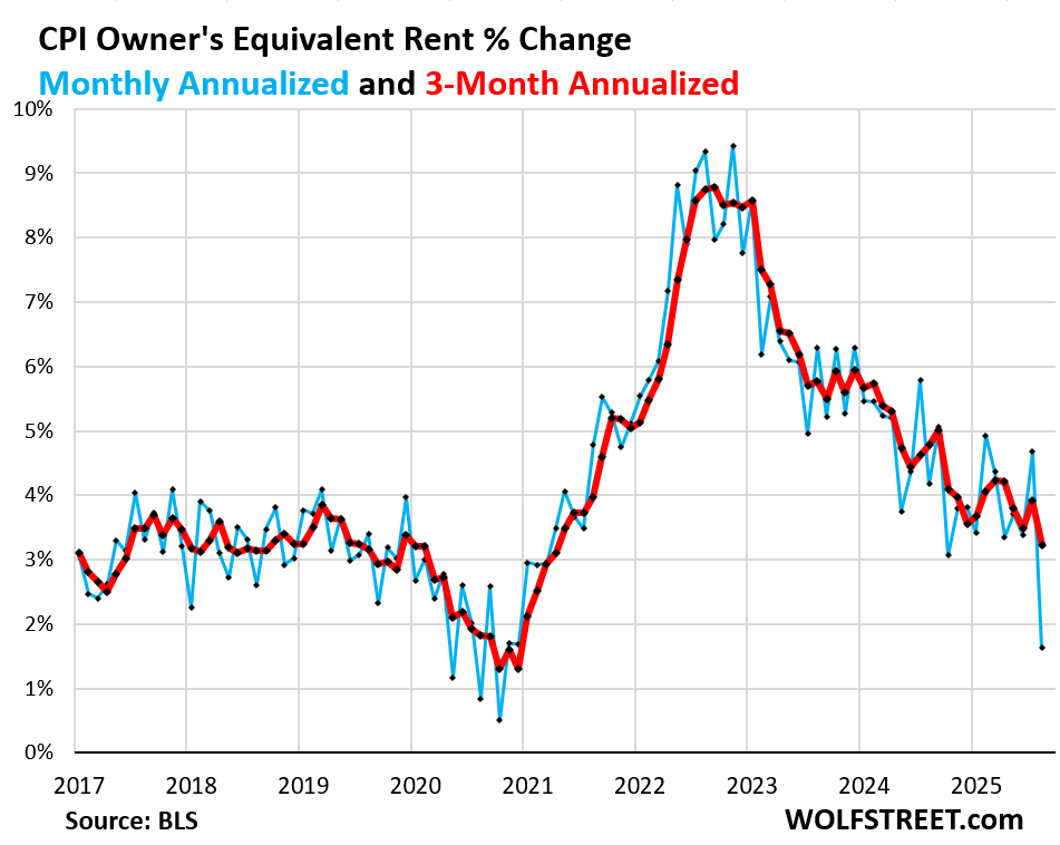 Core services CPI, where OER weighs about 44%, was heavily impacted by the OER outlier: It rose by only 0.24% in September from August (+2.9% annualized).