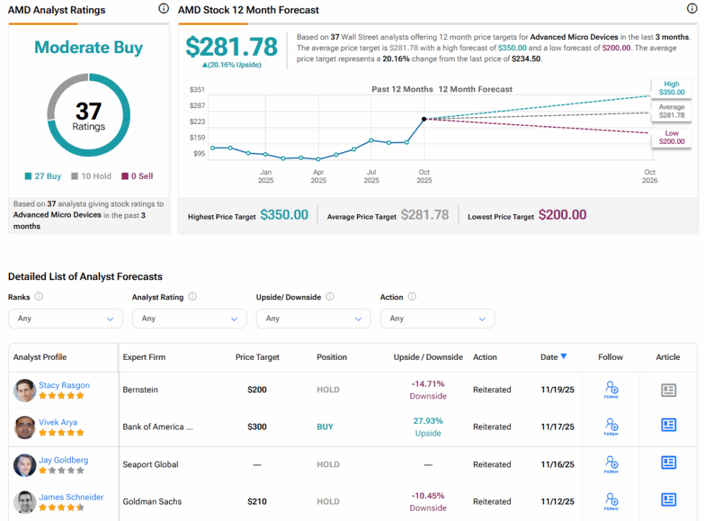 Turning to Wall Street, the analysts’ consensus rating for AMD is Moderate Buy, based on 27 Buy and 10 Hold ratings over the past three months. With that comes an average AMD stock price target of $281.78, representing a potential 20.16% upside for the shares.