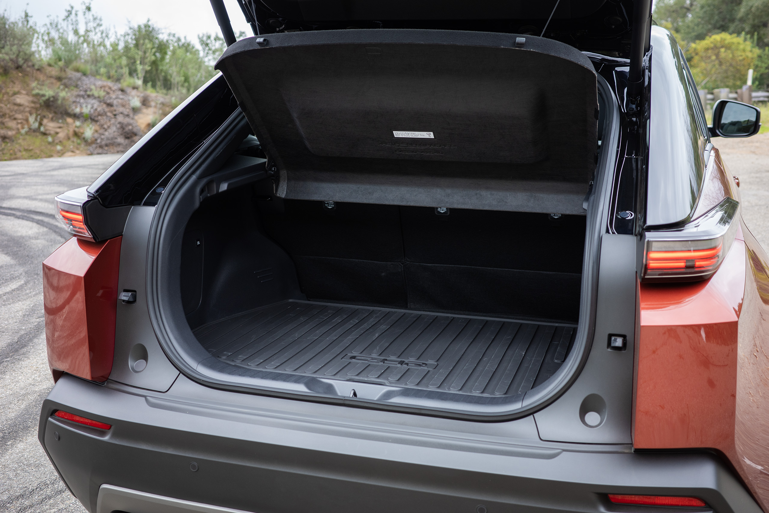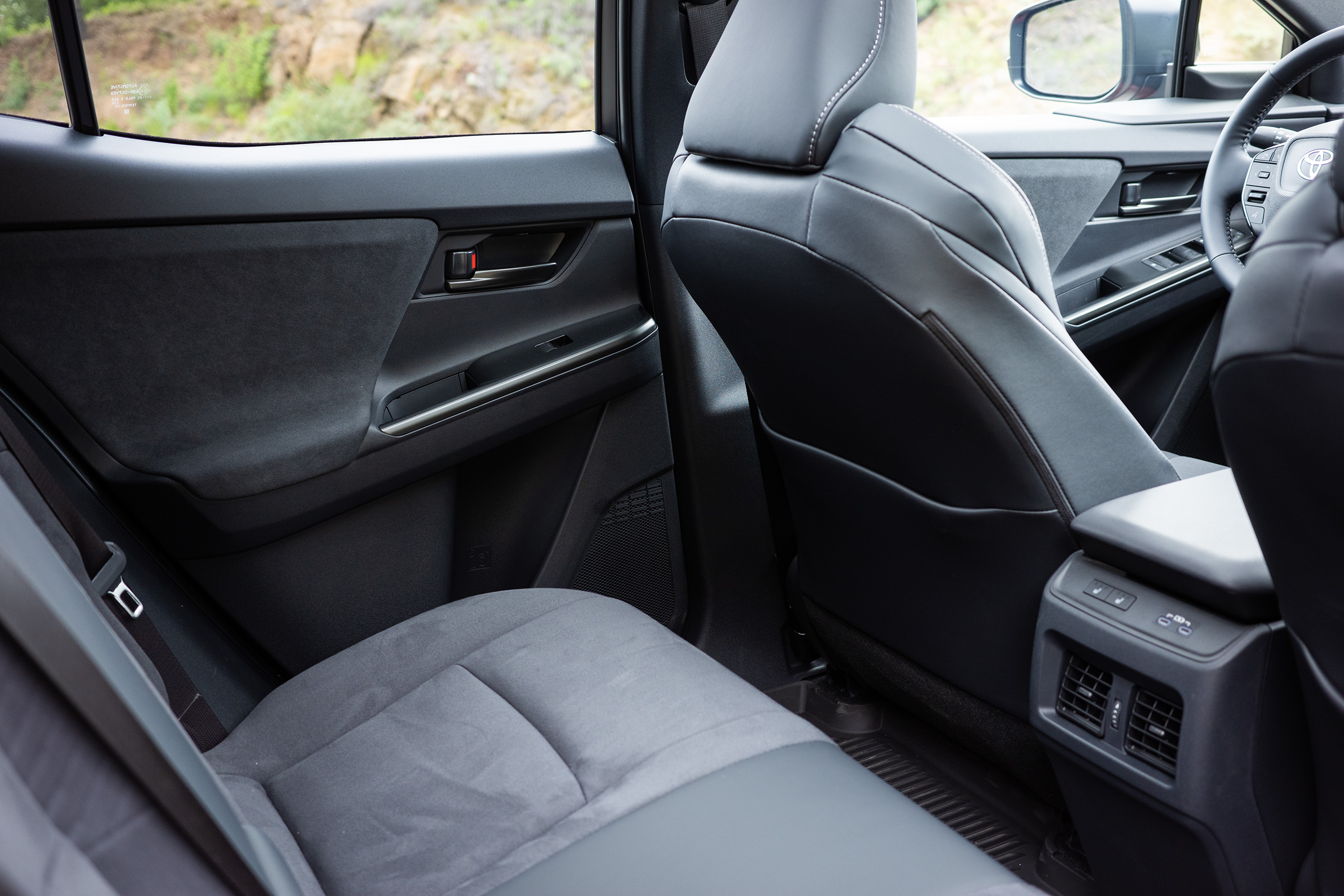 I’ll commend Toyota for designing a very accommodating second row, in spite of this car’s seemingly challenging proportions. With about 37 inches of headroom and 32 inches of legroom, space is quite good, and at 5’10”, I was able to fit comfortably in the back seat. Meanwhile, the rear cargo situation is certainly much better than in, say, a Corolla hatch, but if storage behind the seats is an important consideration, you’d be better served by one of Toyota’s larger EVs. Fair warning: There’s no frunk in any of them, even though there absolutely should be.