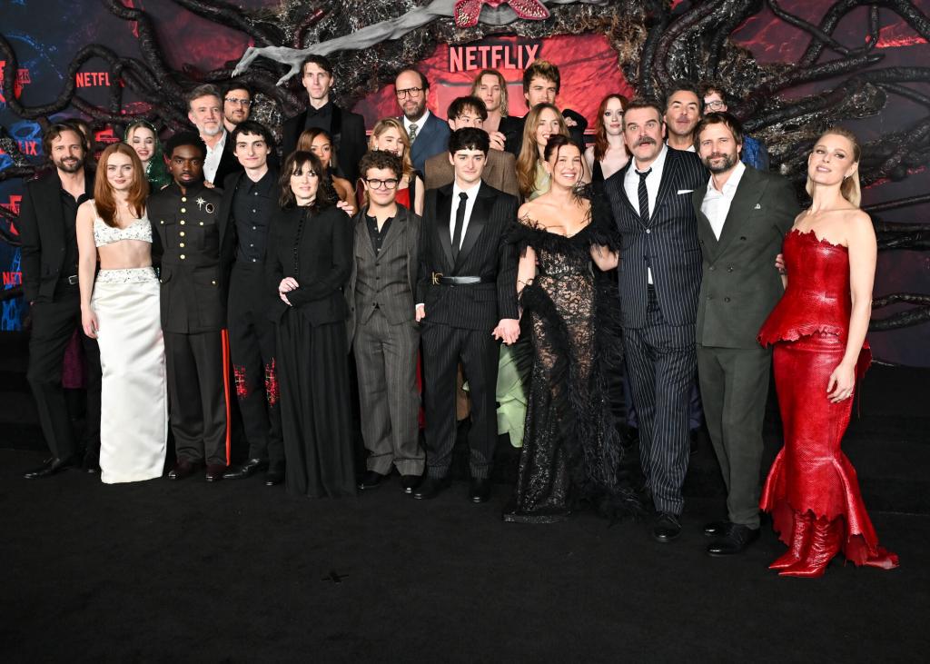 Matt Duffer, Sadie Sink, Nell Fisher, Caleb McLaughlin, Joe Chrest, Finn Wolfhard, Winona Ryder, Priah Ferguson, Alex Breaux, Gaten Matarazzo, Natalia Dyer, Brett Gelman, Noah Schnapp, Charlie Heaton, Jamie Campbell Bower, Joe Keery, Maya Hawke, Millie Bobby Brown, Amybeth McNulty, David Harbour, Shawn Levy, Jake Connelly, Ross Duffer, Cara Buono and guests at the “Stranger Things” Season 5 world premiere in Los Angeles