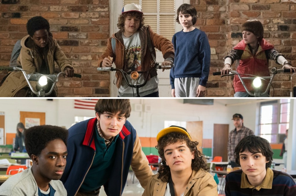Above: Caleb McLaughlin, Gaten Matarazzo, Finn Wolfhard and Noah Schnapp in the series premiere of “Stranger Things,” filmed in 2015; below: McLaughlin, Schnapp, Matarazzo and Wolfhard on the set of Season 5, photographed in 2024