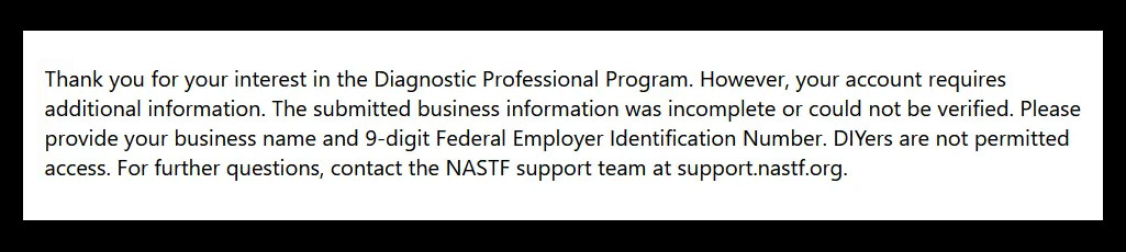They included a photo of a message from NASTF that says in part, “Please provide your business name and 9-digit Federal Employer Identification Number. DIYers are not permitted access.”
