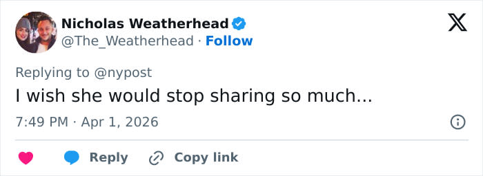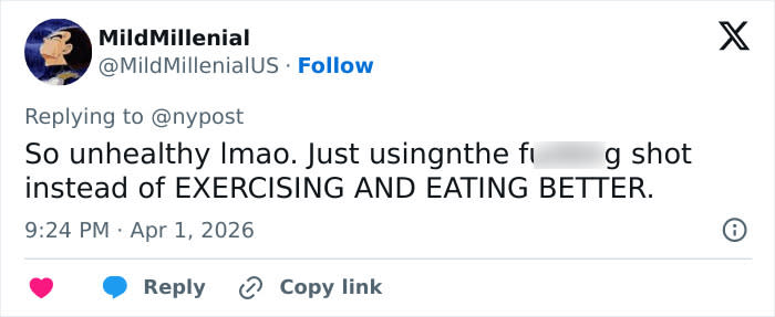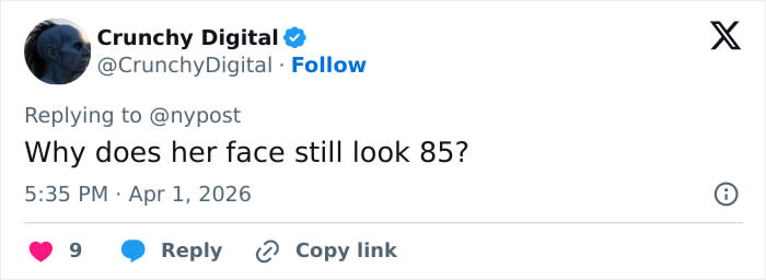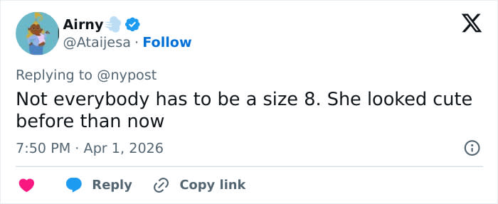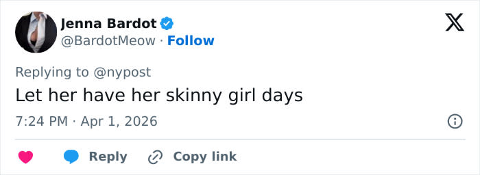 Some comments focused directly on her physique. “Now she should just go to a gym and tone up because there’s no muscle definition whatsoever,” one user wrote, while another claimed, “The O*empic hit everything but her face.”