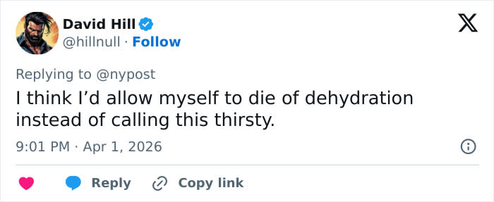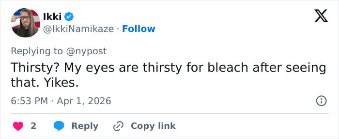 “Oh, I get it. April Fools, right?” one person wrote. Another added, “Thirsty? My eyes are thirsty for bleach after seeing that. Yikes.”