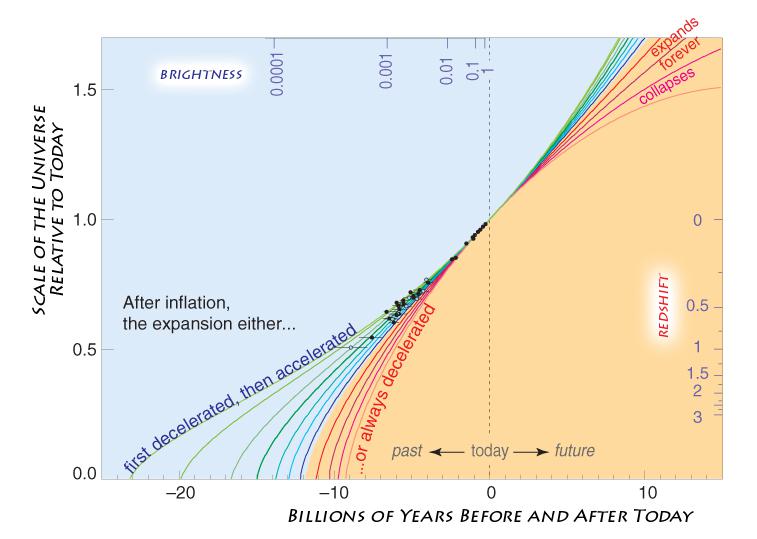 Measuring back in time and distance (to the left of “today”) can inform how the Universe will evolve and accelerate/decelerate far into the future. By linking the expansion rate to the matter-and-energy contents of the Universe and measuring the expansion rate, we can come up with an estimate for the amount of time that’s passed since the start of the hot Big Bang. The supernova data in the late 1990s was the first set of data to indicate that we lived in a dark energy-rich Universe, rather than a matter-and-radiation dominated one; the data points, to the left of “today,” clearly drift from the standard “decelerating” scenario that had held sway through most of the 20th century.