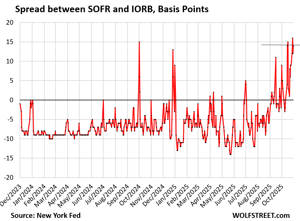 With SOFR at 4.04% and IORB at 3.9% on October 30, the spread between them was 14 basis points. This spread was slightly narrower than on October 28, when it reached 16 basis points.