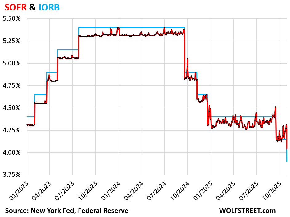 IORB was cut to 3.9% on Thursday as part of the Fed’s rate cuts announced Wednesday afternoon (blue line in the chart below). Normally SOFR (red) would be a few basis points below that. But this is month-end and tighter liquidity, and SOFR was 4.04%, so 14 basis points higher than IORB.