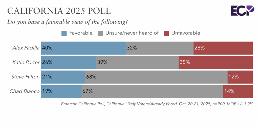 Katie Porter holds a 26% favorable rating, and 35% unfavorable rating. Steve Hilton holds a 21% favorable rating, and 12% unfavorable. Chad Bianco holds a 19% favorable rating, and 14% unfavorable. Senator Alex Padilla holds a 40% favorable rating and 28% unfavorable rating.