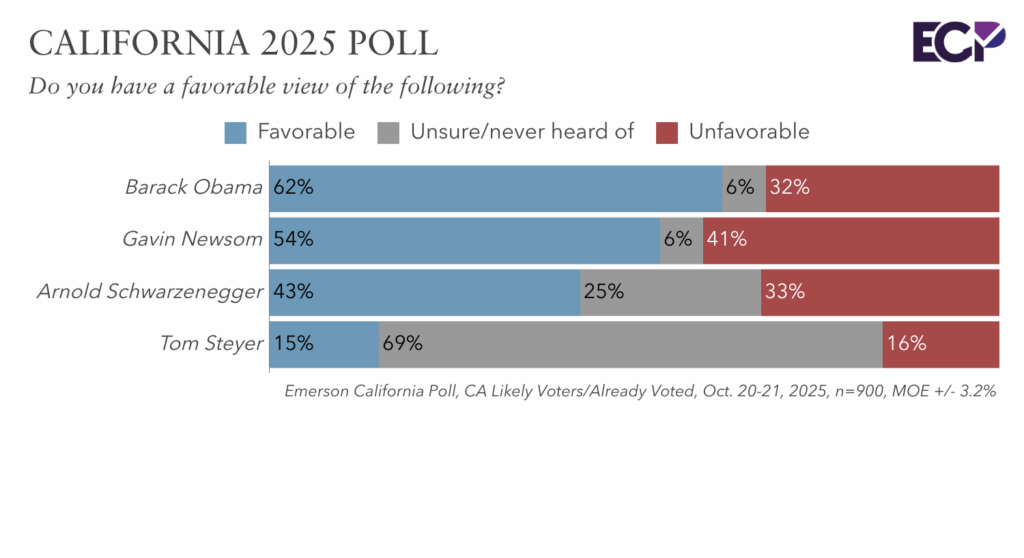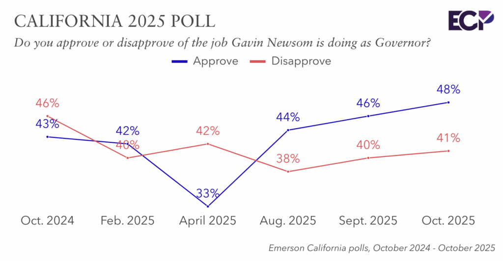 The Emerson College Polling California survey was conducted October 20-21, 2025. The sample of California likely voters, n=900, has a credibility interval, similar to a poll’s margin of error (MOE), of +/- 3.19 percentage points. The data sets were weighted by gender, education, race, age, party, and region based on U.S. Census parameters and voter file data.