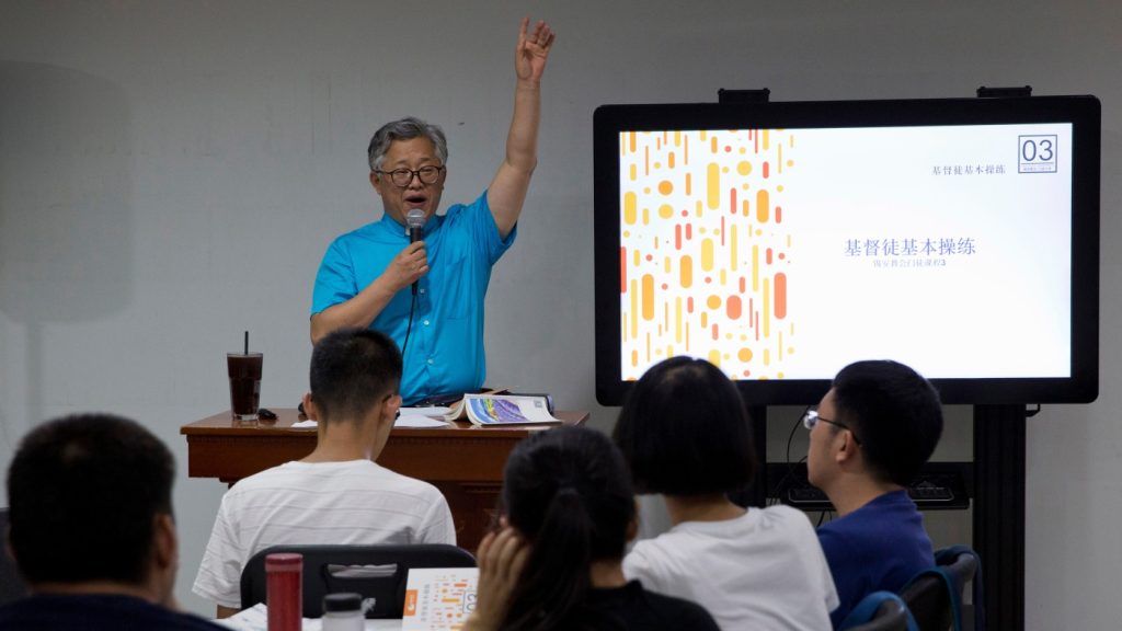 Pastor Ezra Jin leads a class on the basics of Christian beliefs at the Zion Church in Beijing, China, in