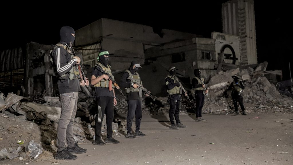 Hamas militants stand guard in Gaza on Wednesday. Hamas police and other armed Hamas members have returned to the streets