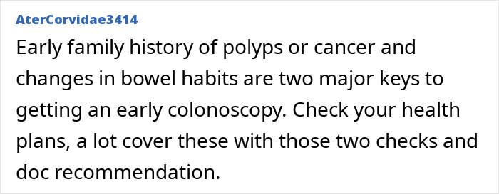 “IF YOU HAVE A HISTORY, GET SCREENED,” one person wrote. “My husband was 6 years away from the recommended age of screening, BUT because of a random symptom, he had a colonoscopy, and they found a pre-cancerous polyp. If we had waited, we would have been too late.”