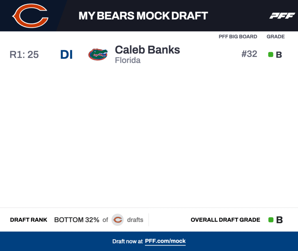 None of the Bears’ interior defensive linemen notched a PFF run-defense grade above 56.0 in 2025, so addressing that early in the 2026 NFL Draft is a good way to fix the run defense. Caleb Banks is a massive presence in the interior at 6-foot-6 and 327 pounds with an 85 3/4-inch wingspan.