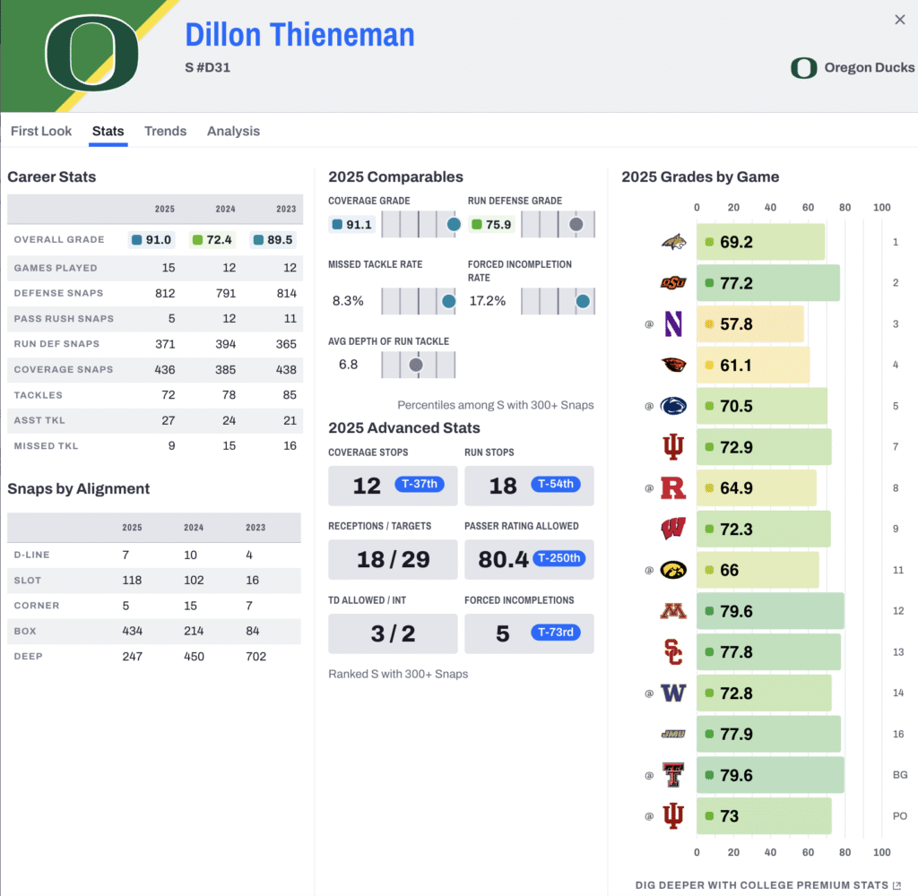 In 2025, McNeil-Warren’s 91.9 PFF overall grade ranked first among all FBS safeties, as did his 92.0 PFF coverage grade. For his career, he logged 966 box snaps, 204 slot snaps and 624 free safety snaps. McNeil-Warren is also an asset in run support, having posted an 83.2 PFF run-defense grade in 2025.