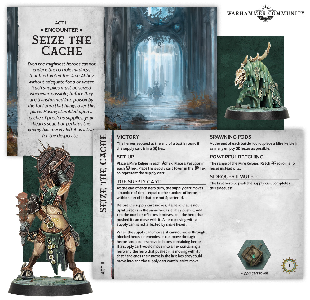 Each map in the book supports multiple encounter cards, which change up the action. The Act II mission Seize the Cache takes place on the same map as Cleanse the Spawn Pit, but adds Pestigors into the mix, buffs the Mire Kelpies, and tasks you with pushing a supply cart through the cloying mire. It’ll require totally different tactics to conquer, and you’ll probably have different equipment too.