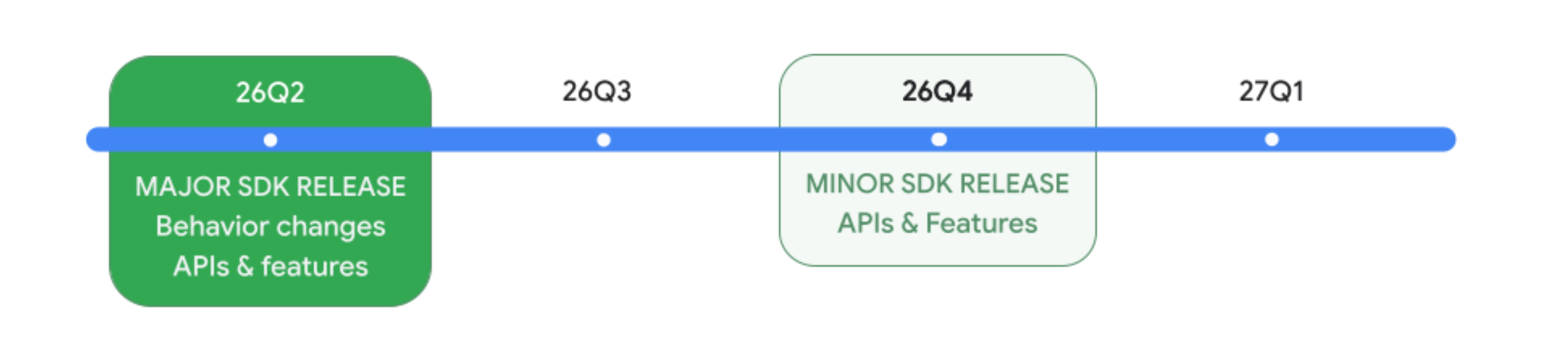 This 26Q2 release is the major SDK release this year with behavior changes, new APIs, and features. It will be followed by 26Q3 (17 QPR1) and 26Q4 (17 QPR2) with a minor SDK release, while 27Q1 (17 QPR3) will round out Android 17.