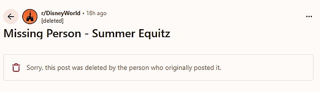 Prior to Equitz’s death, a missing persons page was created on a Reddit forum for Disney fans, apparently by a relative.