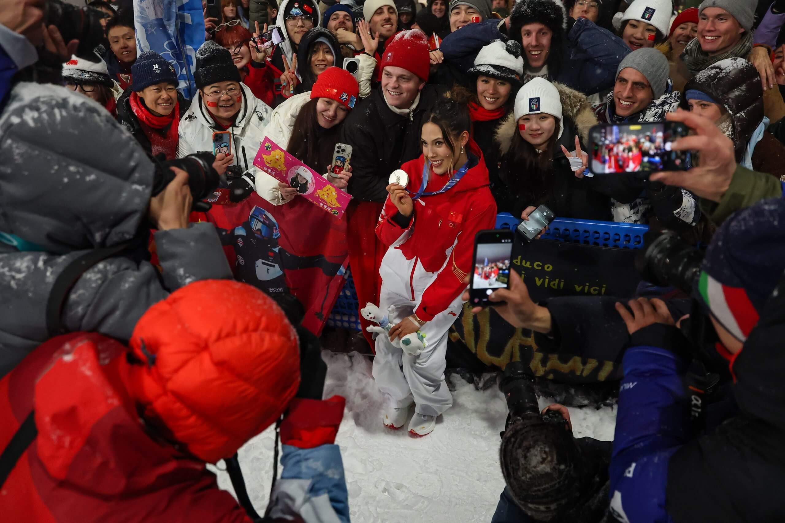 Eileen Gu with fans after winning silver in the women’s freeski big air at the Milan Cortina Games. (Patrick Smith / Getty Images)