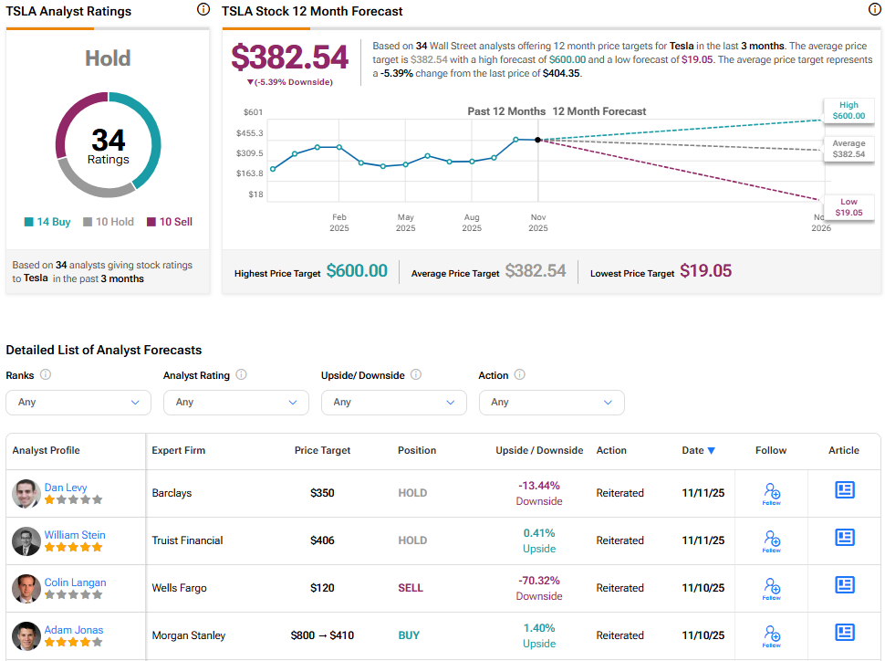 Tesla continues to divide opinions among the Street’s analysts with a Hold consensus rating. The average TSLA stock price target stands at $382.54, implying a 5.39% downside from the current price.