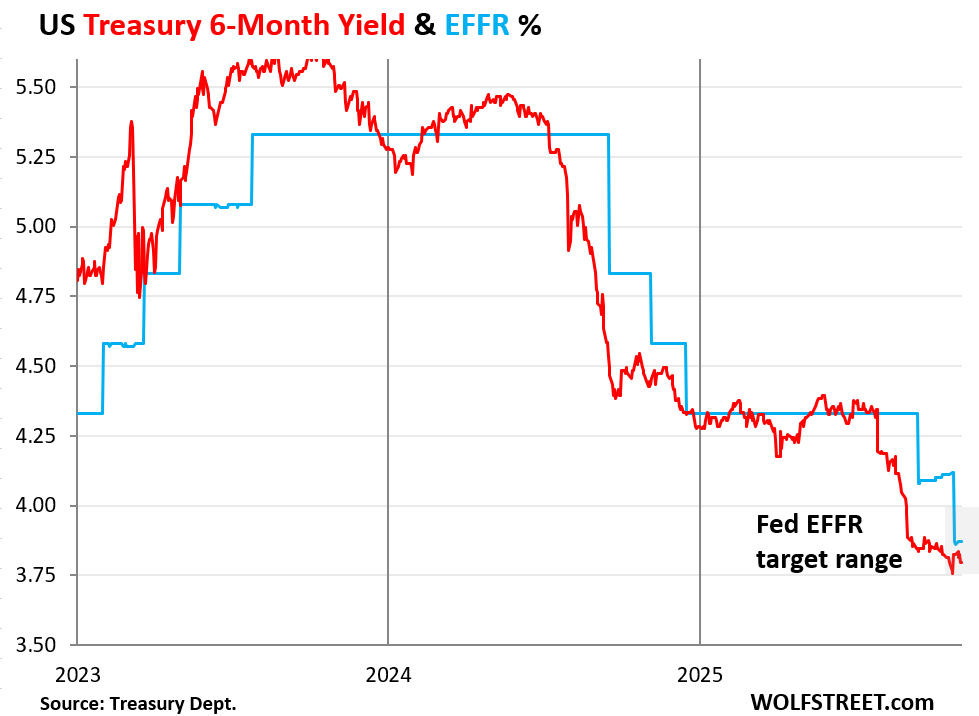 The 1-month yield (3.88%) is boxed in by the Fed’s policy rates (3.75%-4.0% since the October rate cut) and closely tracks the EFFR (3.87%). That’s the only yield that dropped since the October rate cut.