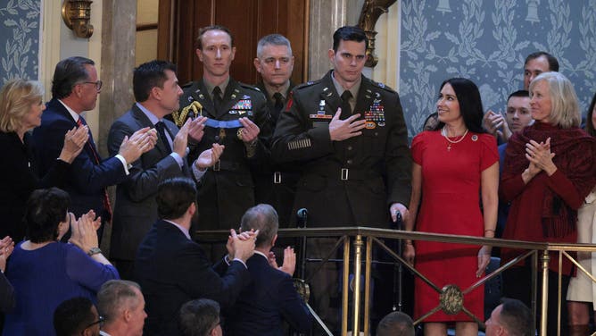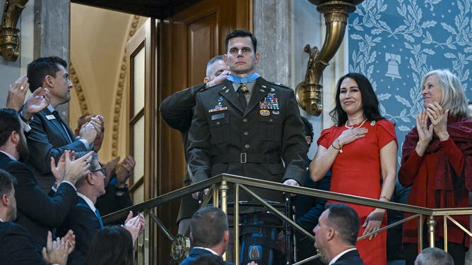 U.S. Army Chief Warrant Officer Eric Slover receives the Medal of Honor during President Donald Trump’s State of the Union address in the House Chamber of the U.S. Capitol on Tuesday, February 24, 2026. Slover was wounded in the January 2026 mission to capture Venezuelan leader Nicolás Maduro. (Tom Williams/CQ-Roll Call, Inc via Getty Images)