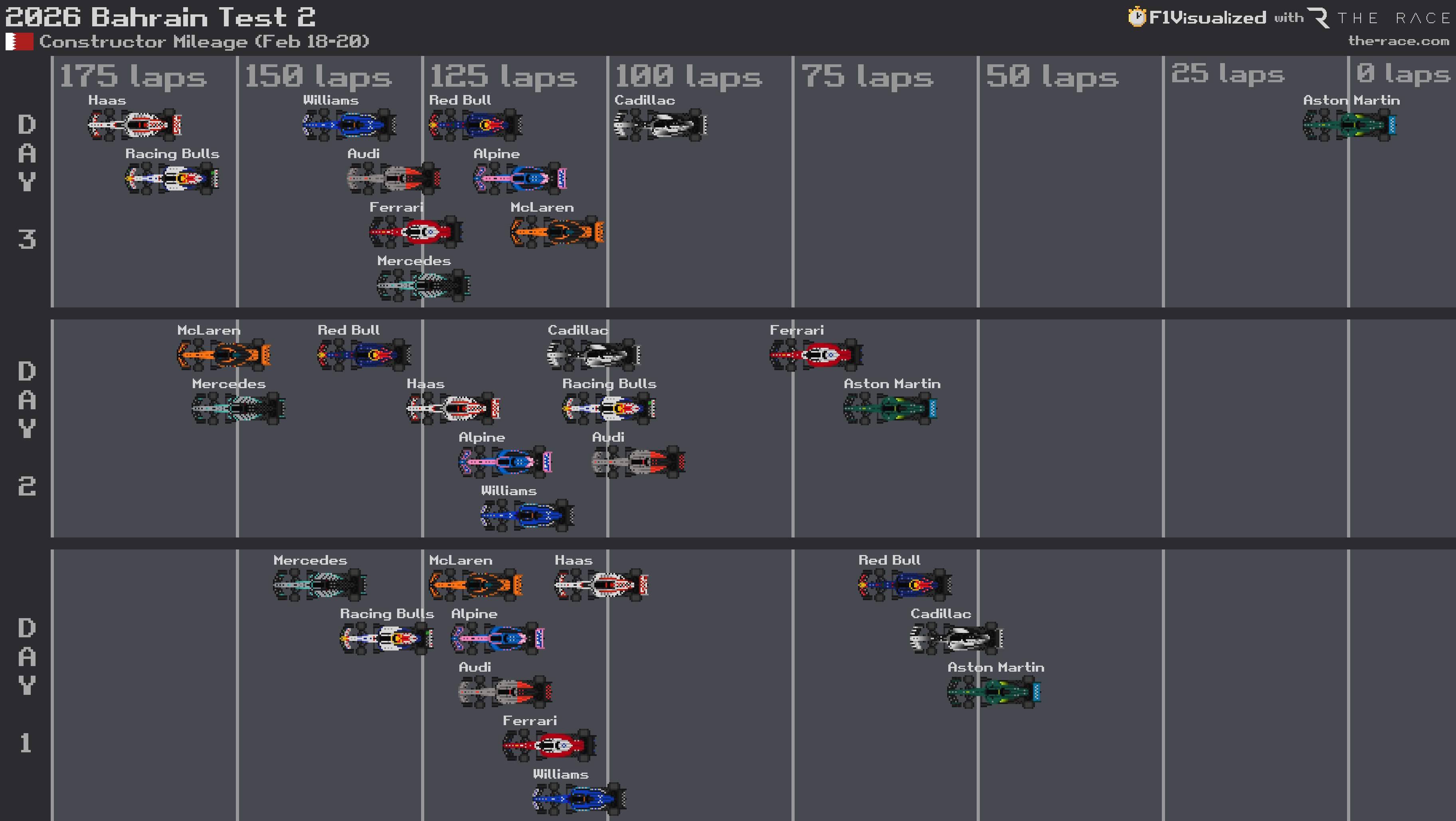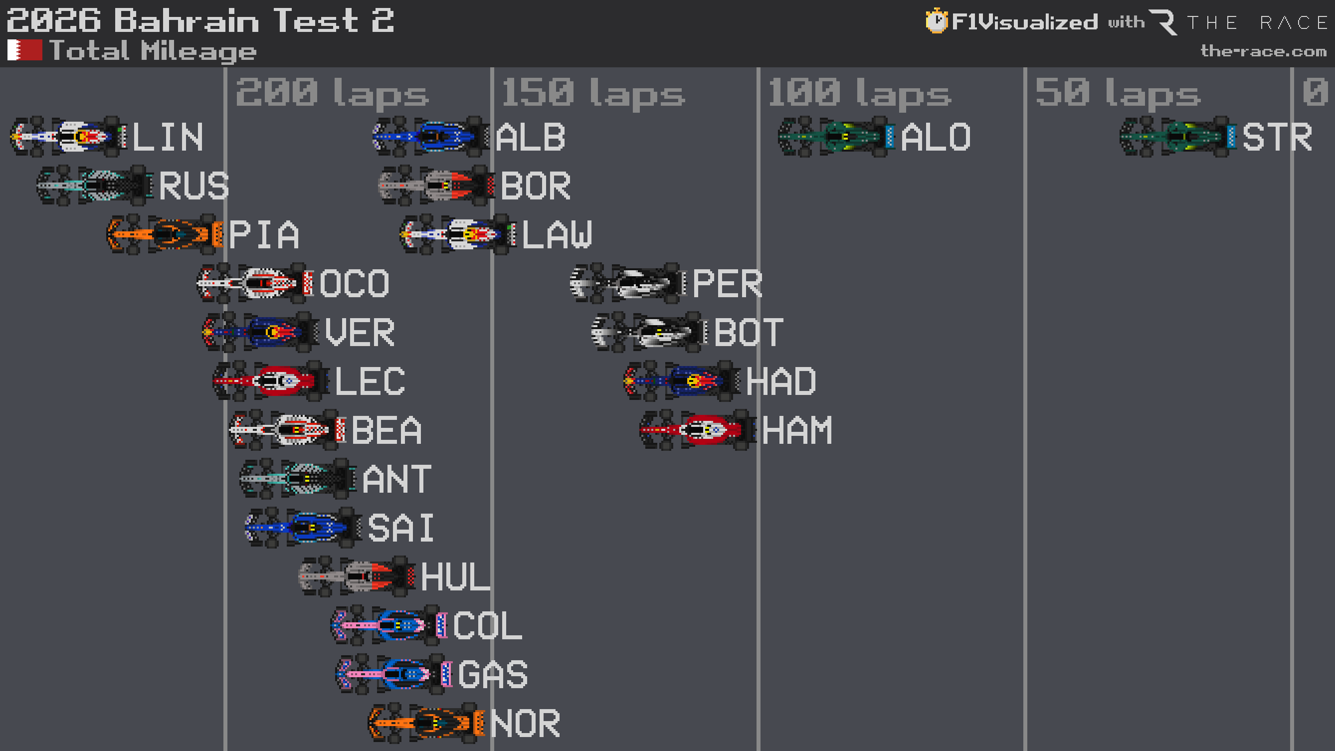 As we produced end-of-test times and totals for the first Bahrain test last week and the Barcelona ‘shakedown week’ test at the end of January, we’ve provided the data for the second week in Bahrain AND every team’s combined testing mileage below: