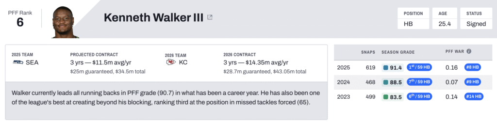 Walker was PFF’s highest-graded running back (91.4) in 2025, and he also earned Super Bowl MVP honors. He ranked among the top 10 running backs in PFF overall grade in 2023 and 2024, as well. However, there are still concerns about this acquisition, as the Chiefs made Walker the fourth-highest-paid running back in the league. While he was excellent in his role with the Seahawks, he hasn’t topped 500 regular-season snaps in any of the past three seasons. Across his four seasons in Seattle, he ranked just 17th among all running backs in snaps (2,038).