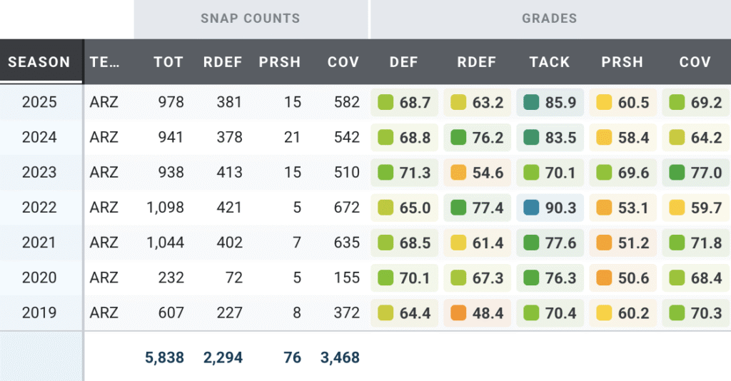 The Cardinals signed one of the most consistent guards in football to stabilize their offensive line. The former Pittsburgh Steeler ranked among the top 20 guards in PFF overall grade in three of his past four seasons. His 73.3 PFF overall grade in 2025 placed him 16th among 79 qualifying guards.