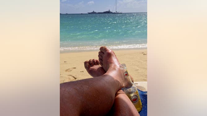 On the beach today looking out at Jerry Jones mega yacht Bravo Eugenia. When were the Cowboys last in the Playoffs?Panthers fan! We are sipping Amstel Brights on the beach. Life is pretty good.