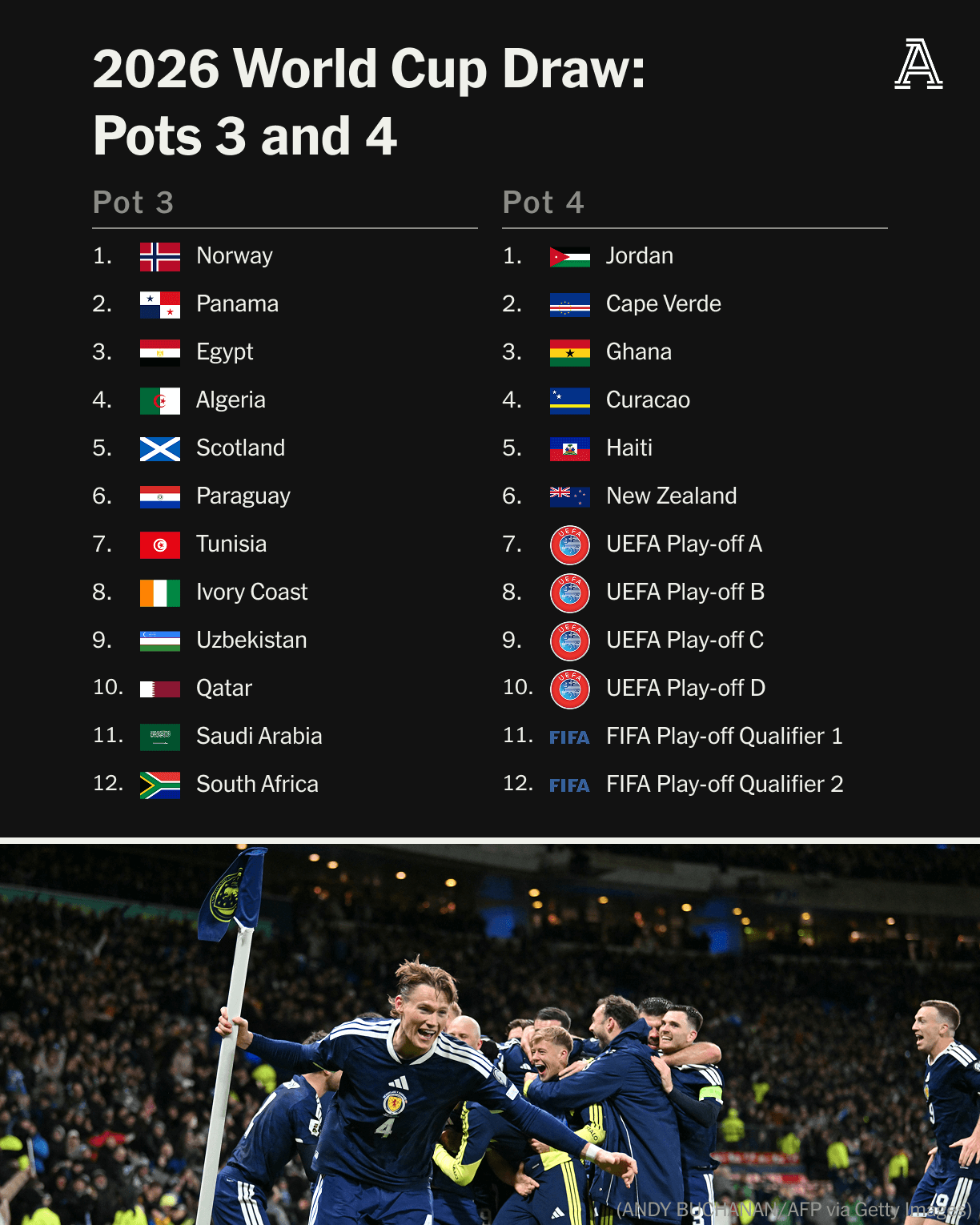 - Pot 3: Norway, Panama, Egypt, Algeria, Scotland, Paraguay, Tunisia, Ivory Coast, Uzbekistan, Qatar, Saudi Arabia, South Africa