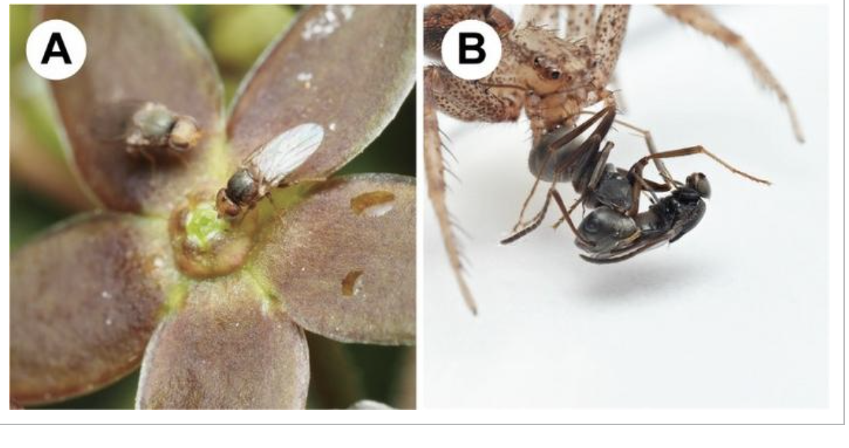 The flies visit the plant because they are searching for injured ants to feed on and lay eggs in. They inadvertently pollinate the plant in the process, helping it reproduce even though they receive nothing in return from the flower.