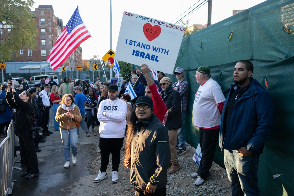 Tickets for the free event sold out in 48 hours, according to Mamdani’s campaign. Outside the venue, a small group of protesters bearing Israeli flags booed supporters as they checked in.