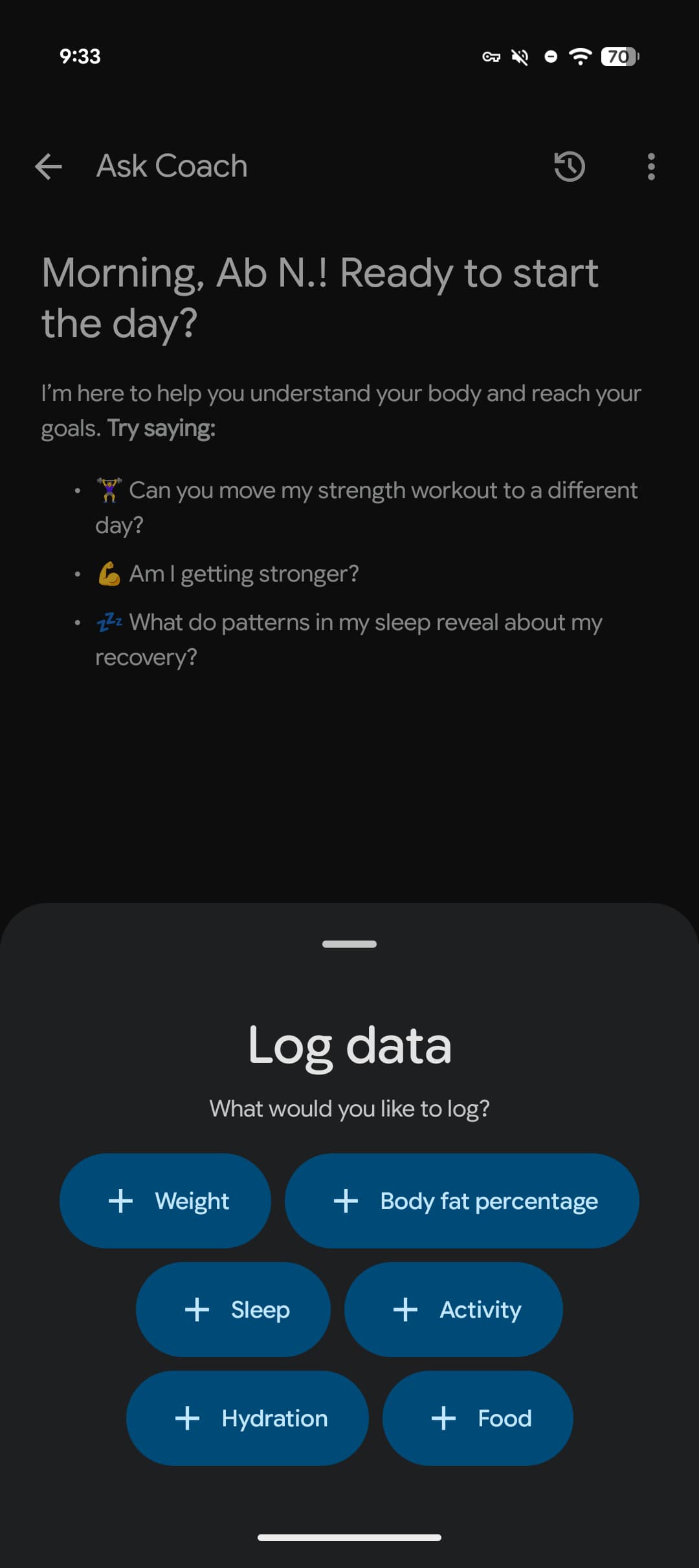 When you tap the “Ask Coach” FAB (floating action button) in the bottom-right corner and then “Log” in the prompt box, you have two new options.