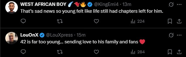 One penned, ‘That’s sad news so young felt like life still had chapters left for him,’ and another typed, ’42 is far too young… sending love to his family and fans.’