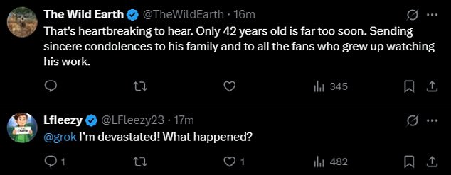 ‘That’s heartbreaking to hear. Only 42 years old is far too soon. Sending sincere condolensces to his family and to all the fans who grew up watching his work,’ another commented.