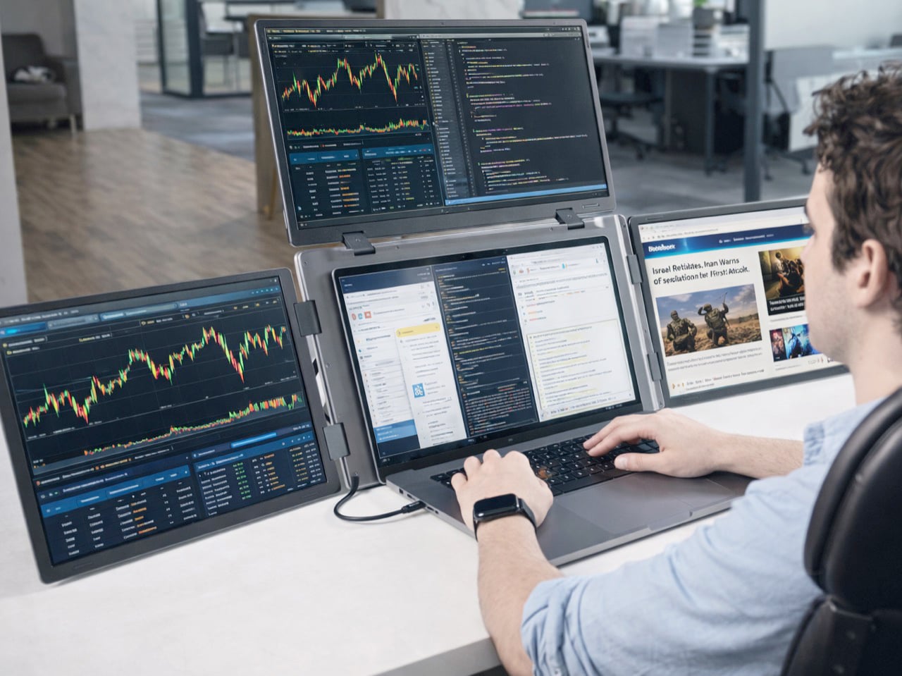 Developers get a dedicated code editor, terminal, documentation window, and live preview running simultaneously across three full-size panels, which is a different working experience from tab-switching on one screen. Traders and analysts can spread charts, order books, news feeds, and dashboards across all three displays in real time. Video editors get a proper timeline, preview window, and asset panel layout without compromise. The chassis fits laptops from 12 to 18 inches, with full support for Intel and Apple Silicon Macs plus Windows 10 and 11. The Mac Mini M4 also works with it, which opens up interesting configurations for people who want a powerful stationary setup without a traditional monitor.
