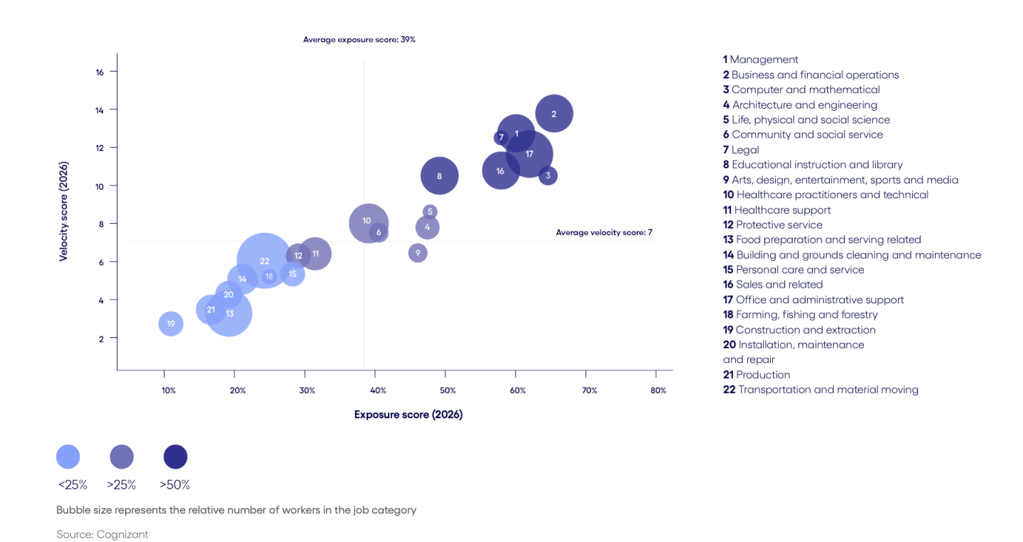 Professional services company Cognizant (number 217 on the 2026 edition of the Fortune 500) has reassessed its estimate of AI’s impact on the workplace, and the results are starker than before. They’ve updated their original forecast made in 2023—formulated by examining 18,000 tasks and nearly 1,000 jobs from the U.S. Department of Labor occupational data—to find that 93% of jobs could undergo at least some disruption from the technology. And the threat has become existential for a wider range of jobs. The research found that 30% of jobs could face an existential threat from AI, 15 percentage points higher than the initial assessment. In total, the report estimates AI-driven disruption could shift roughly $4.5 trillion in labor from humans to machines.