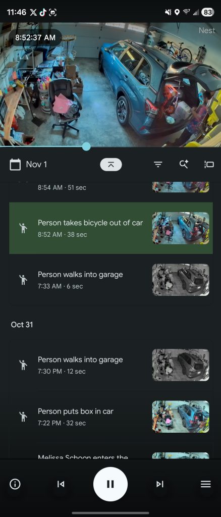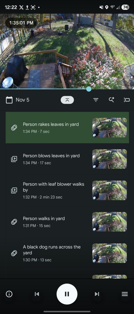Gemini’s summaries of what happened in a given piece of Nest footage are sometimes accurate, but sometimes make Google Home look like a fool. For every “Ben is in the kitchen cooking chicken” – yes, it managed to correctly recognize chicken – there’s a “Ben loads a bicycle into the car” when, in fact, I did not. It’s usually minor stuff like this. Mislabeling an object that’s not quite sure what to do with. For instance, the “bicycle” I took out of the car was actually a disc golf cart (which looks nothing like a bike), and I didn’t actually take it out of the car in the clip that was labeled. There was another instance where my wife took the trash outside, but Gemini labeled that as her placing a package on the porch. For some reason, Gemini also can’t decide if my car is blue, which it is, or gray, which it is not even close to. I’ll certainly give it credit for accurately being able to tell the right make and model of both of our cars, though. Similarly, it also sometimes identifies the same event in different ways. While using a leaf blower in the backyard, Gemini changed its mind halfway through and said I was using a rake instead.