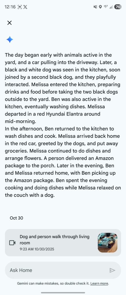 These same issues bleed over to “Home Brief.” The summaries are a useful way to get a quick overview, but they are too confident about what they’re trying to say. I also feel like this feature is too eager to make a long list. “Ben sat on the couch” really provides no value in one of these summaries in my book. “Ask Home” only has one headache so far, at least to me, which is that it’s kind of slow. Again, the feature is generally way faster than scouring through the footage yourself, but it’s just slow enough to respond to your query that it can be frustrating. I definitely don’t need it to be instant, but waiting 15-25 seconds while it “thinks” feels like a bit of wasted time.