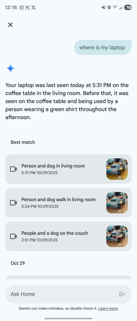 Starting with “Ask Home,” the ability to just search for a thing that happened instead of combing through footage is awesome. Being able to know my camera was watching and ask “where is my laptop” only to get a response is just… well, it’s the future, isn’t it?