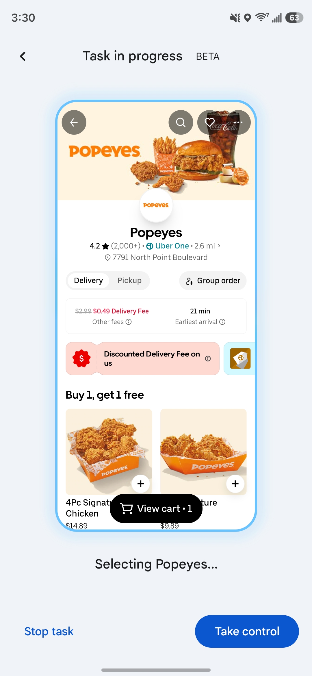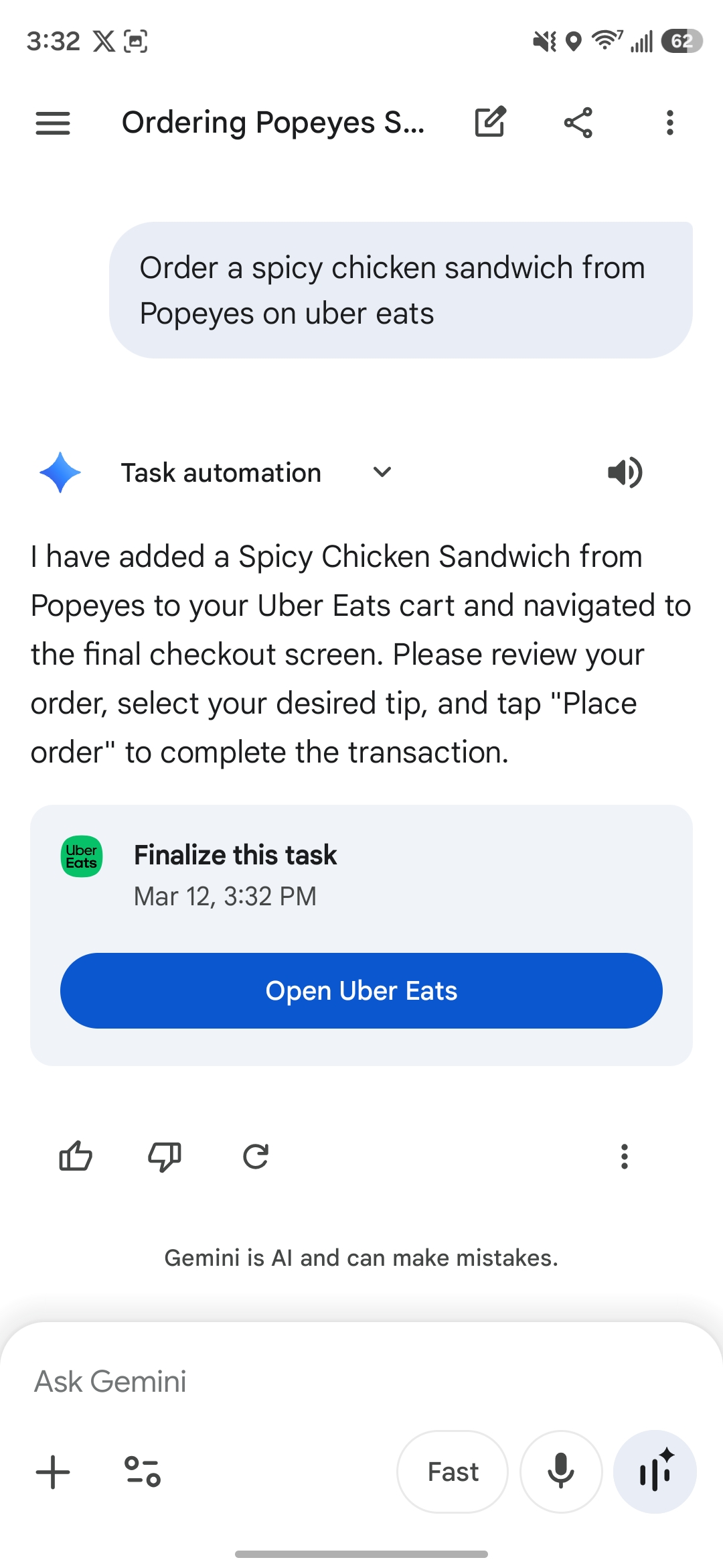 In testing Gemini task automation out on Galaxy S26 Ultra, we were able to ask for Gemini to “order a spicy chicken sandwich from Popeye’s on Uber Eats” and, as expected, automation took over and started the process in the background. Gemini will add items to your cart, but it won’t finalize checkout. When it reaches that point, it’ll send a notification (including a strong vibration) and hand the controls back over to you to finalize the process. It even skips the add-on pages in Uber Eats, skipping straight to the end of the process where you select a driver tip and actually place the order.
