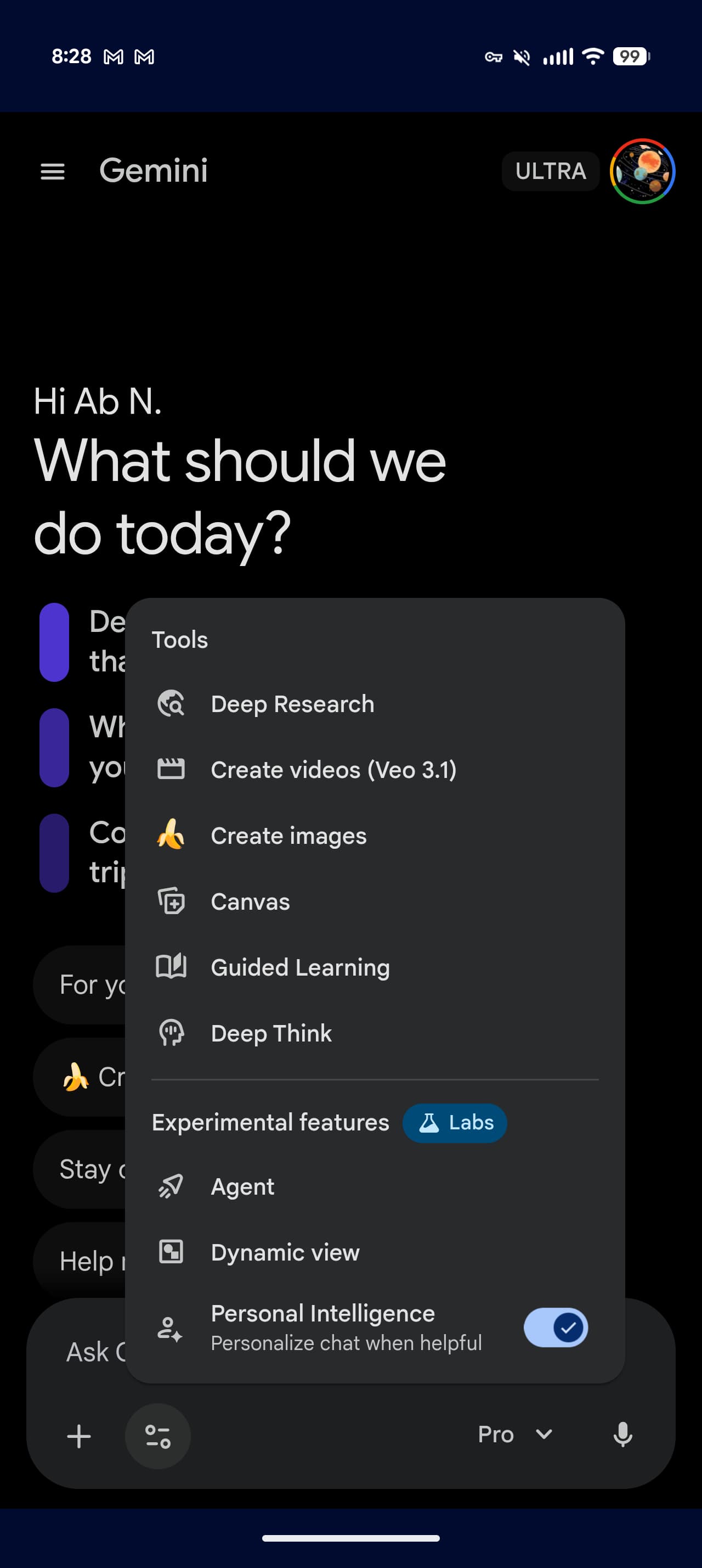 Gemini Tools menu adds Labs section, Personal Intelligence toggle
