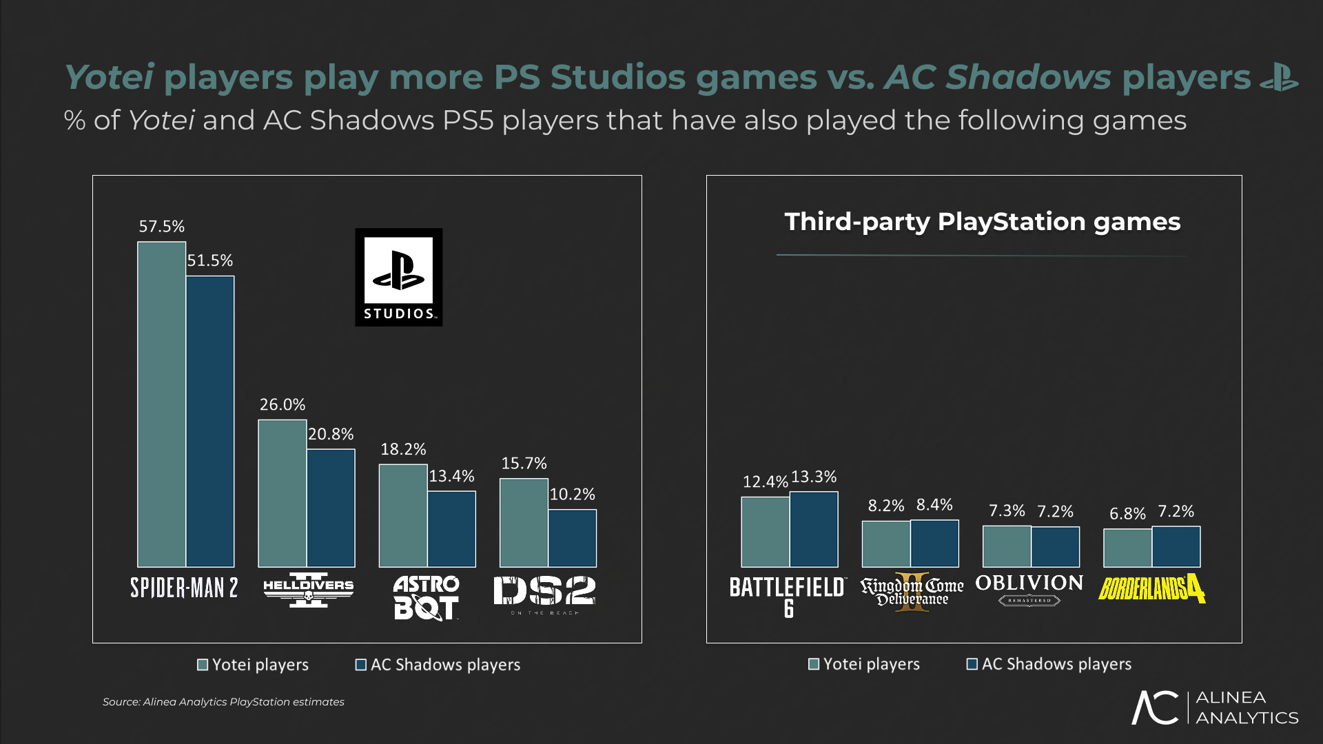 Our player crossover estimates show that Yotei players are more likely to have played almost every PlayStation first- and second-party game versus Shadows players. Meanwhile, the crossover share for third-party games is more equal between Yotei and Shadows.