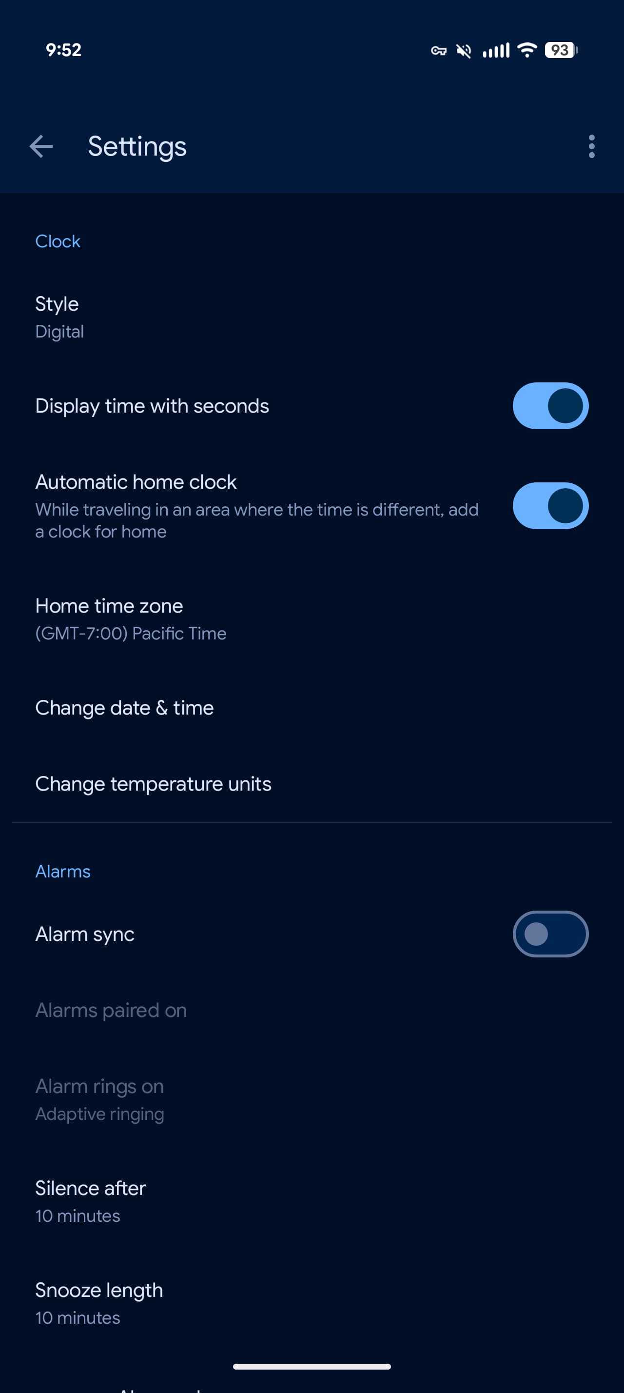 Speaking of Alarms, a small tweak in overflow menu > Settings sees “Alarms” appear first in the list. “World Clock” is now in the second position to match the bottom bar order, while “Timers” and “Screen saver” round out the list.