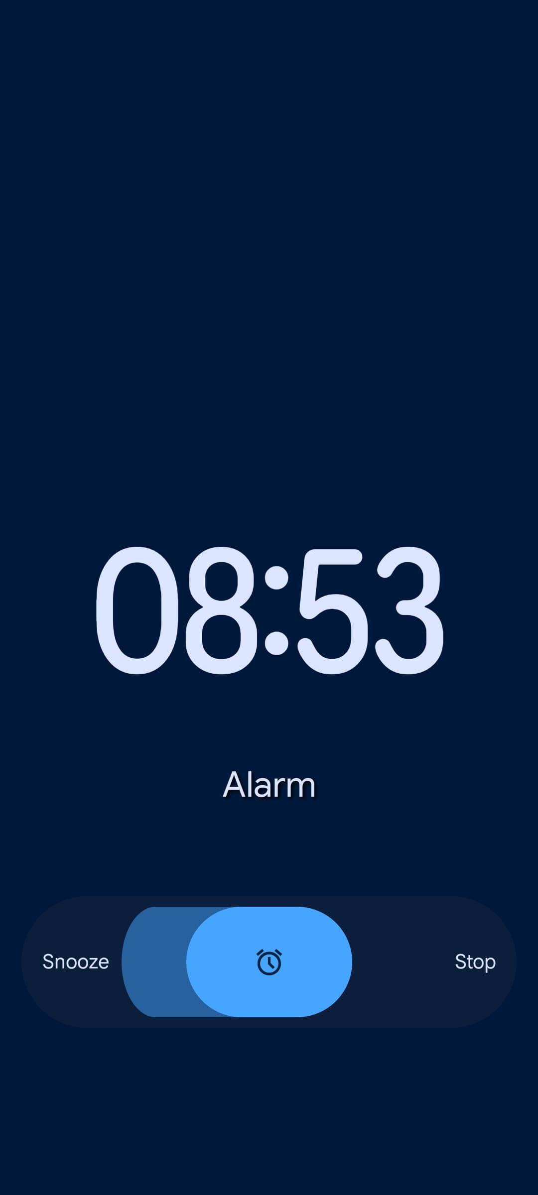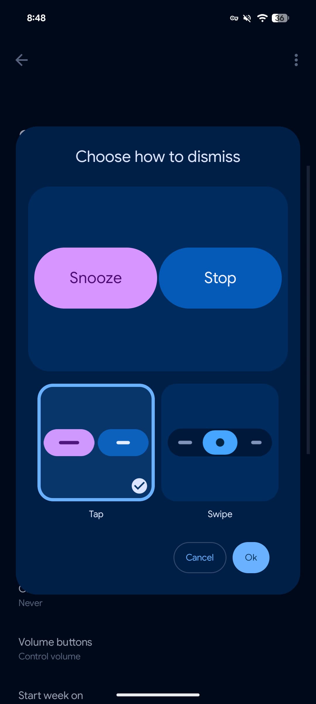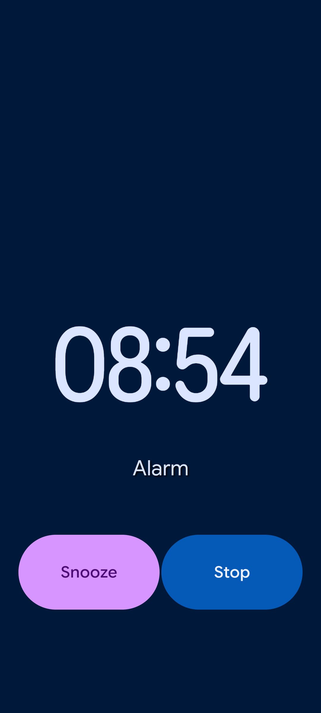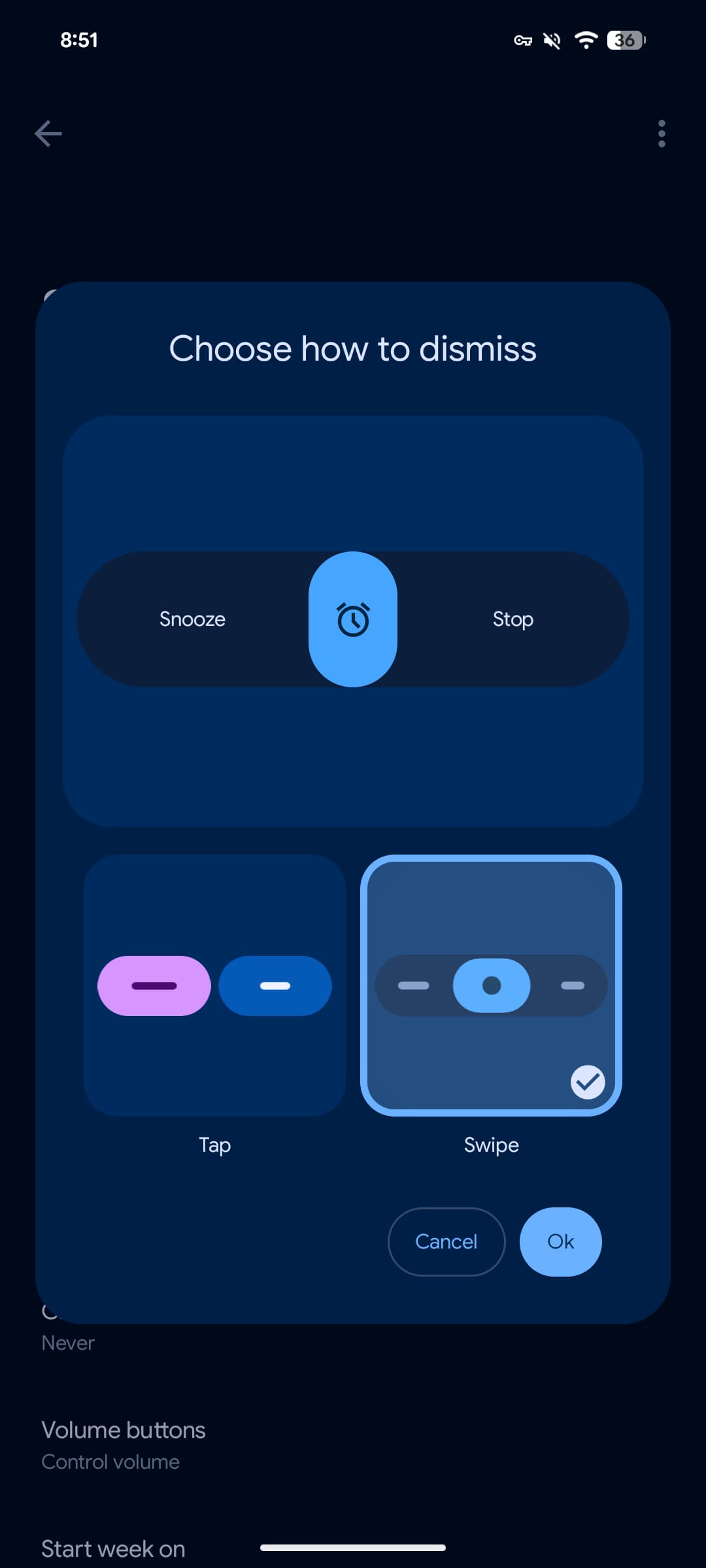 Tap — which has large pill-shaped buttons that are themed with Dynamic Color — is now joined by Swipe. “Snooze” is on the left and “Stop” is at the right, with guide animations inside the container.