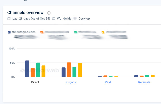 I’ve anonymized the data, but those are three other websites in our competitive set. We’ve been around the same size for the last year, although we’ve been bigger than the other sites at various points. You can see that we have a much larger share of direct traffic, even if organic (Google products) is lower. In general, we have a lot of direct traffic, which is good. We also have a lot of engaged time as people read our articles. Most of our stats have stayed approximately the same, and just to make it more confusing, we’ve performed better on Google News since Google rolled out the Core Update we think hit us.