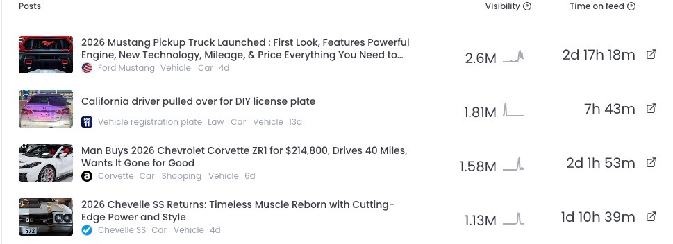 I did a trial with a company that provides a monitor of Google Discover traffic to surface which stories are doing well. You can see what’s working above in the automotive category, and it’s largely AI hallucinations coming from websites that are in the “MFA” or “Made for Advertising” category. [Editor’s Note: We did cover that DIY plate also, to be fair. – JT] This is the worst of the worst, with terrible interfaces, awful toe fungus ads, and content that is both made up and boring.